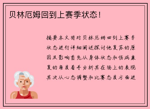 摘要:本文将对贝林厄姆回到上赛季状态进行详细阐述,探讨他复苏的原因及影响。首先从身体状态和伤病康复的角度着手,分析其在场上的表现;其次从心态调整和比赛态度方面进行分析,探究其在比赛中的表现是否有所改变...