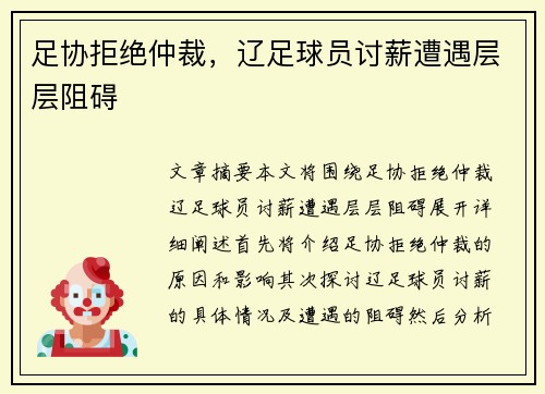文章摘要:本文将围绕足协拒绝仲裁、辽足球员讨薪遭遇层层阻碍展开详细阐述。首先,将介绍足协拒绝仲裁的原因和影响;其次,探讨辽足球员讨薪的具体情况及遭遇的阻碍;然后,分析导致讨薪遭遇阻碍的深层原因;最后,...