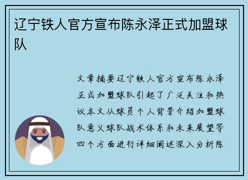 文章摘要:辽宁铁人官方宣布陈永泽正式加盟球队,引起了广泛关注和热议。本文从球员个人背景介绍、加盟球队意义、球队战术体系和未来展望等四个方面进行详细阐述,深入分析陈永泽加盟辽宁铁人的意义和影响。令人期待...